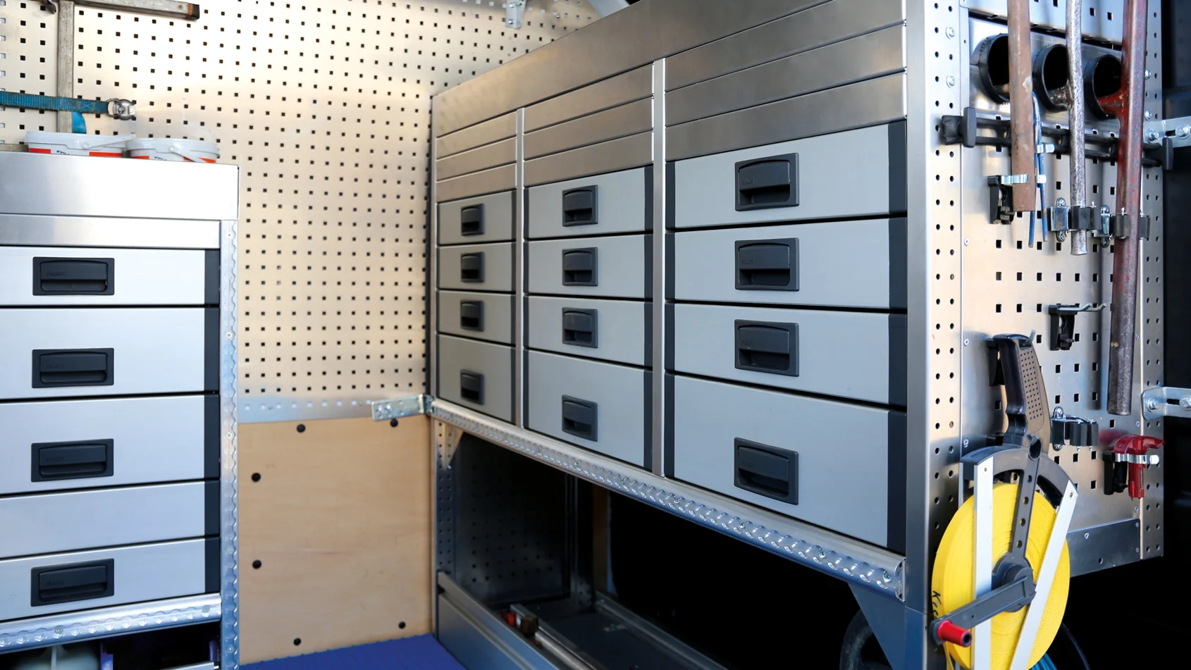 Ein durchdachter Ausbau erleichtert nicht nur den Arbeitsalltag, sondern schafft echte Effizienz: Werkzeuge, Ersatzteile und Materialien sind sicher verstaut und sofort griffbereit. Damit werden Suchzeiten reduziert und Arbeitsabläufe optimiert. Auch in Sachen Sicherheit überzeugt eine strukturierte Fahrzeugeinrichtung: Lose Gegenstände werden zuverlässig gesichert, wodurch das Verletzungsrisiko bei plötzlichen Bremsmanövern deutlich sinkt.