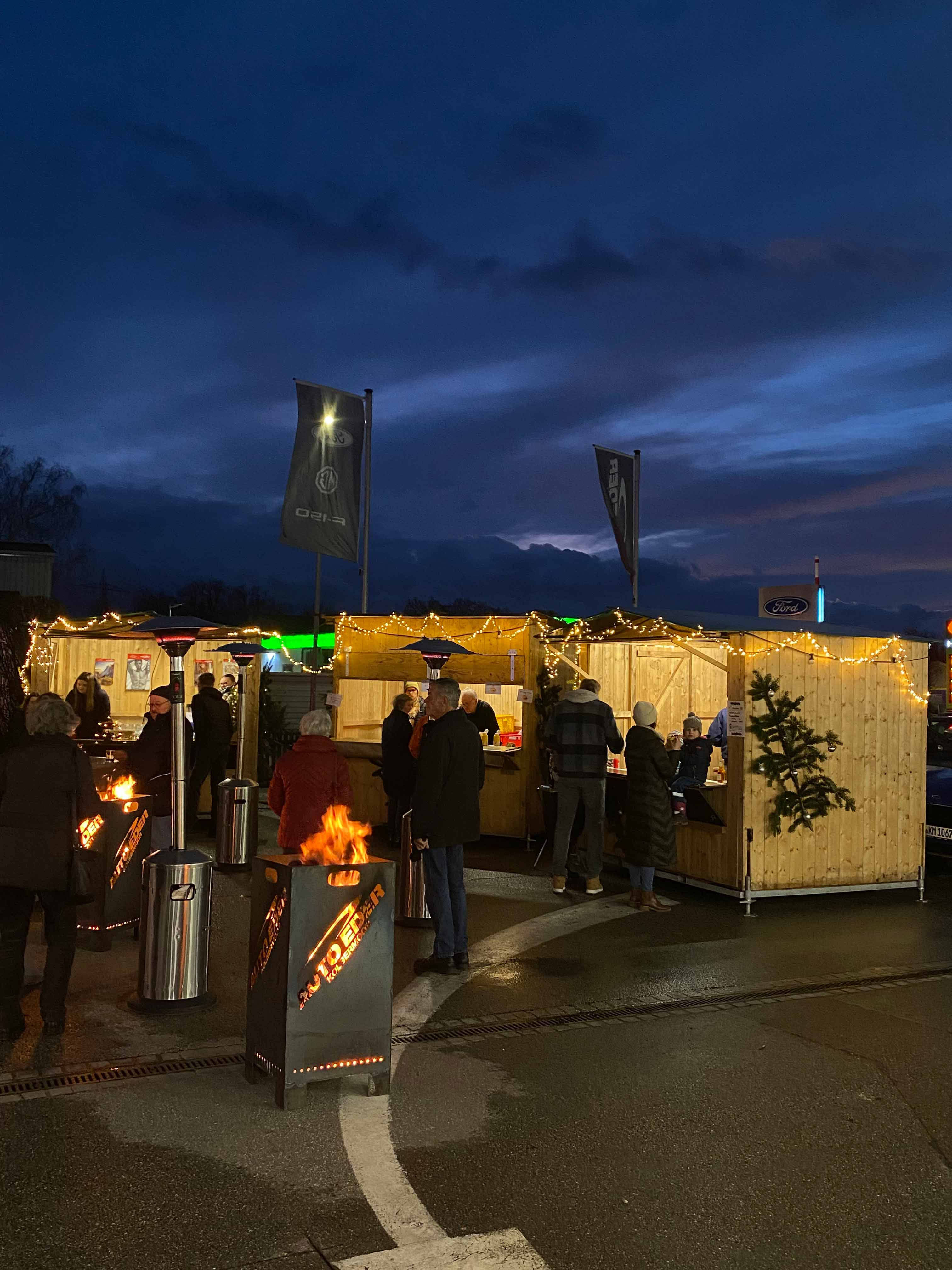Mit köstlichen Bratwurstsemmeln, würzigem Raclettekäse, süßen Naschereien und wärmenden Getränken wie Glühwein und Punsch war für das leibliche Wohl bestens gesorgt. Die Atmosphäre wurde durch stimmungsvoll dekorierte Hütten und gemütliche Feuerschalen perfekt abgerundet.